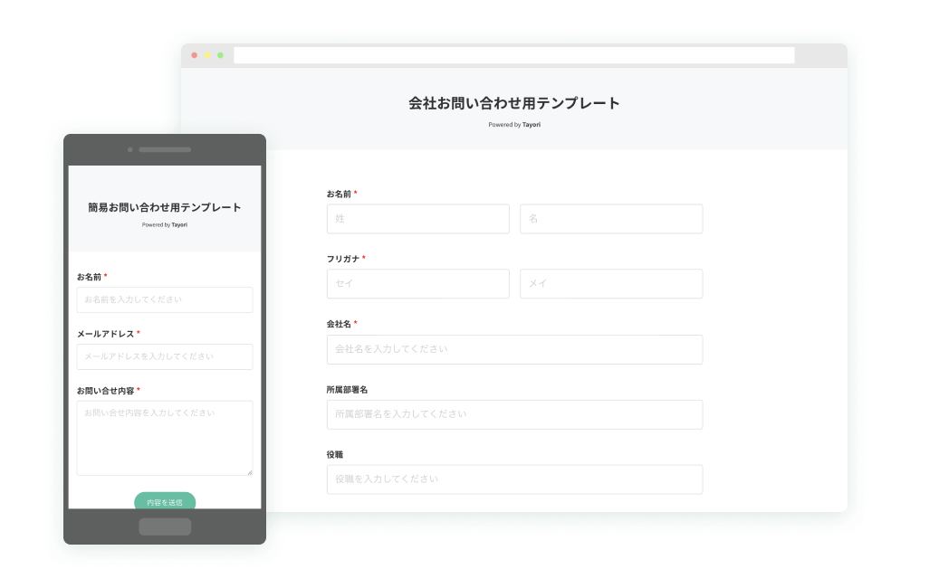 Tayoriのメールフォームには、「簡易お問い合わせ用」「会社お問い合わせ用」など、あらかじめ入力項目が設定してある7種類のテンプレートがあります(テンプレートなしで自由に作成することも可能です)。